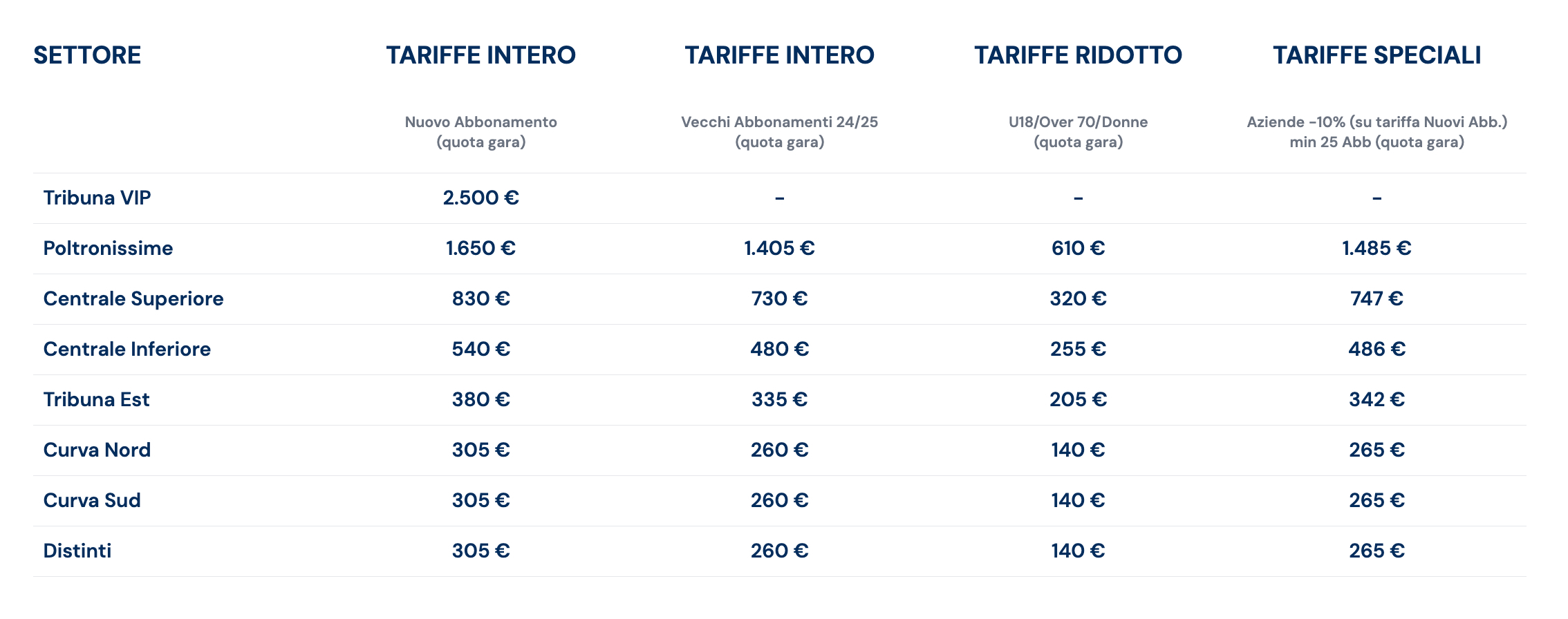 Durante questo periodo, non saranno emessi nuovi abbonamenti né cambi posto. Si ricorda che, per tutto il periodo di prelazione (21 luglio – 08 agosto), i posti resteranno bloccati in attesa del rinnovo da parte dell'abbonato 24/25. Coloro i quali volessero cambiare il posto della scorsa stagione dovranno attendere l'avvio del periodo "VENDITA LIBERA".